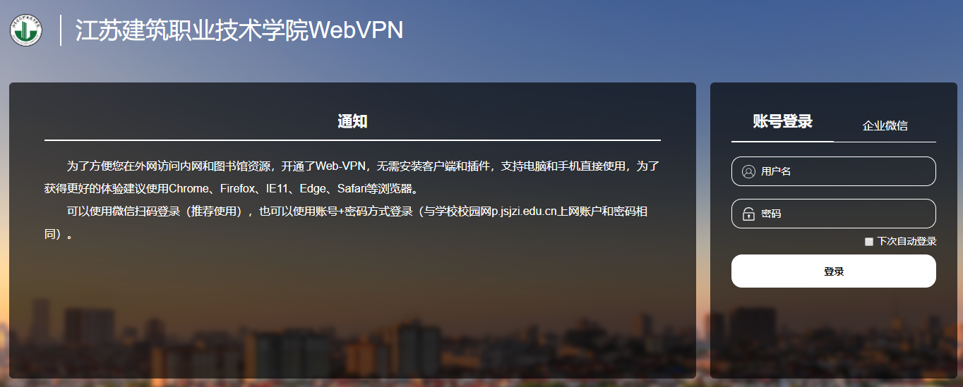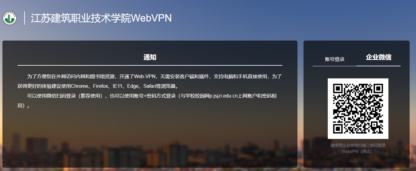为了方便我校师生在校外学习和办公,提升数字资源访问体验,江苏建院部署了VPN系统,包括WebVPN和SSL-VPN两种。WebVPN不需要安装客户端,通过PC浏览器或手机即可使用校内资源;SSL-VPN需要自动下载客户端,支持的应用更丰富。两种VPN均支持微信扫码登录,在校外可以方便方便的使用校内资源,请广大师生根据实际情况进行选用。建议如下: