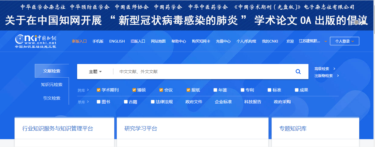 以知网CNKI为例,单击“知网期刊”打开知网后,即可访问各类资源。